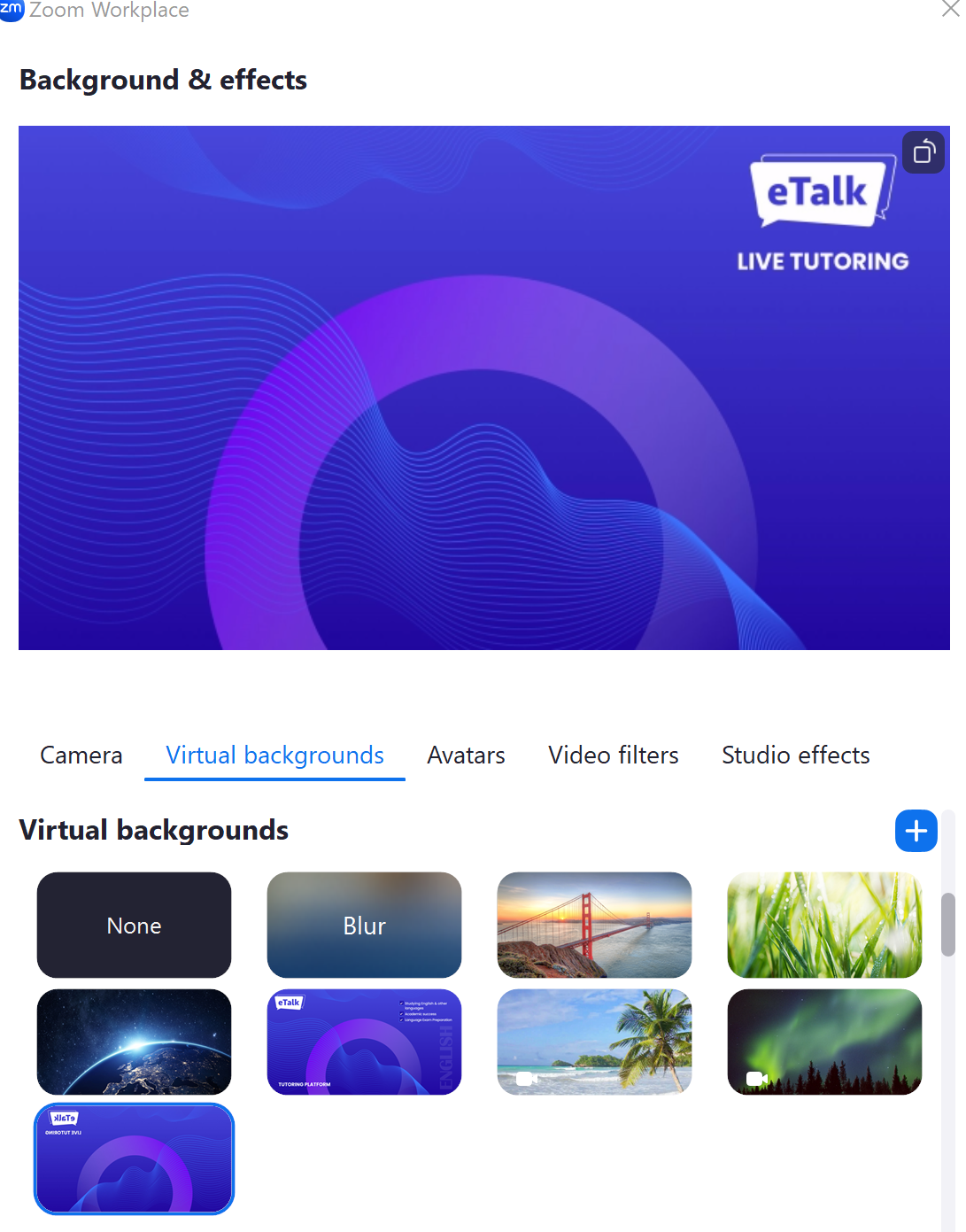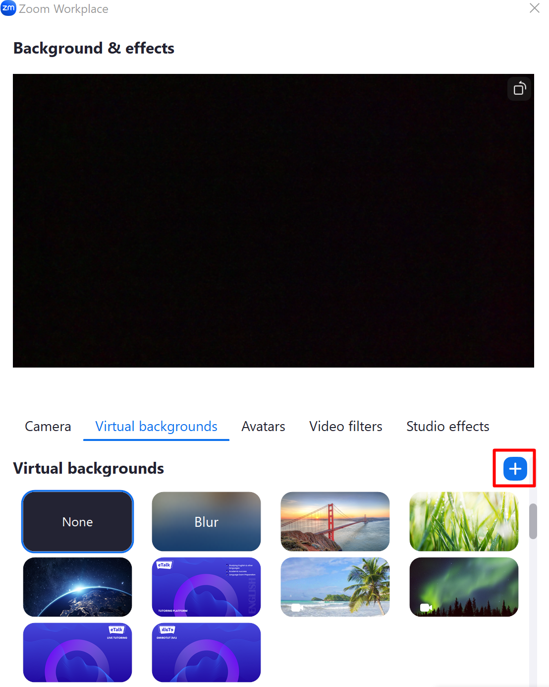 - In the tab that opens, find "Virtual backgrounds" and click on the plus sign, as shown in the screenshot.